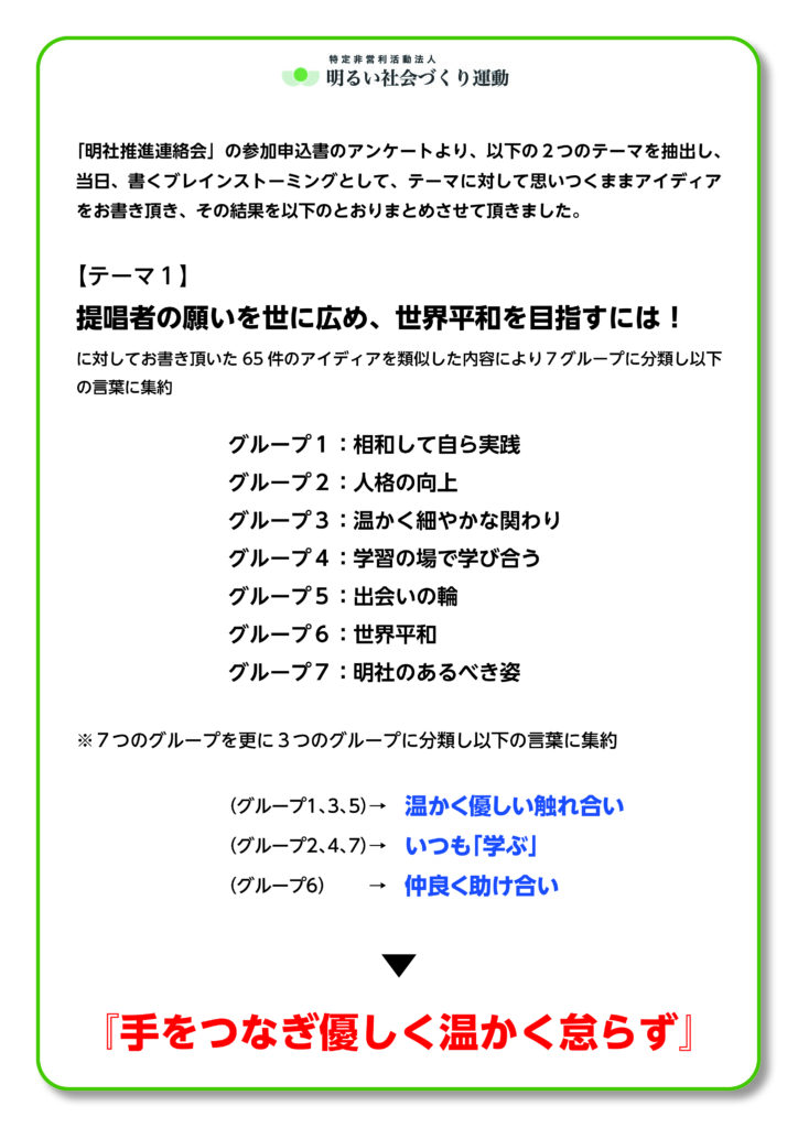 「活動は手段であり、真の目的は世界平和である」「私たちはそのための縁づくりの役割を果たすべきである」など、活発な意見が交わされ、有意義な連絡会となりました。